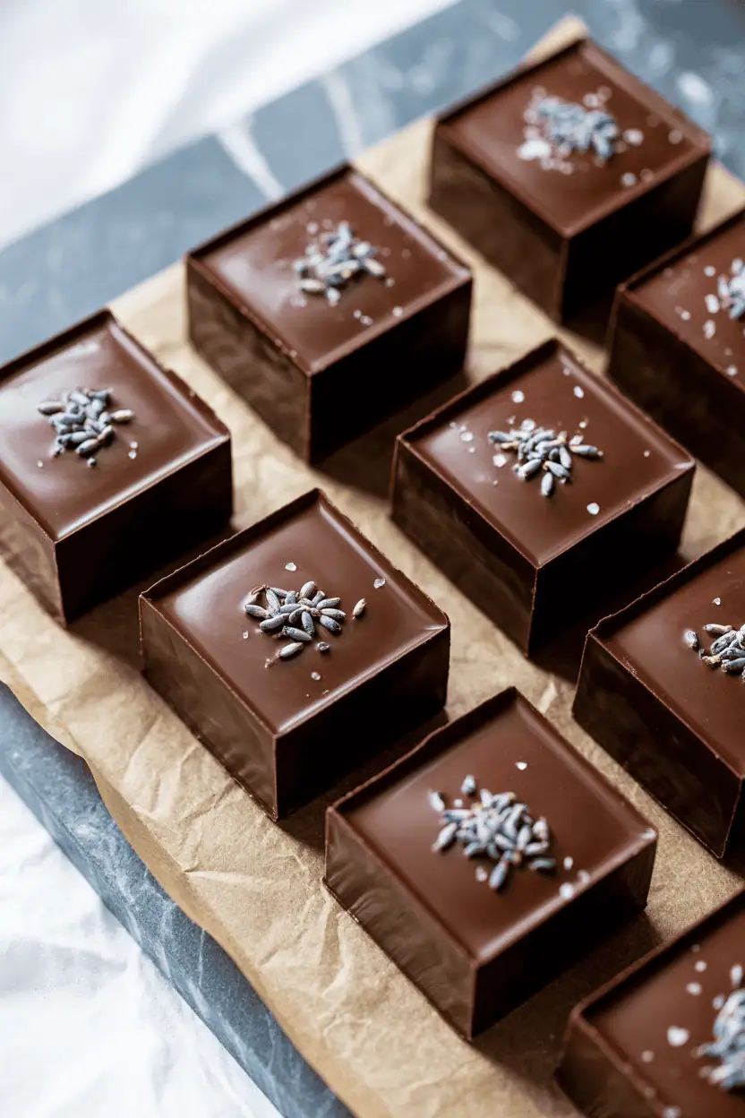 Rich dark chocolate meets delicate lavender in these elegant, bite-sized treats — perfect chilled or gently warmed.